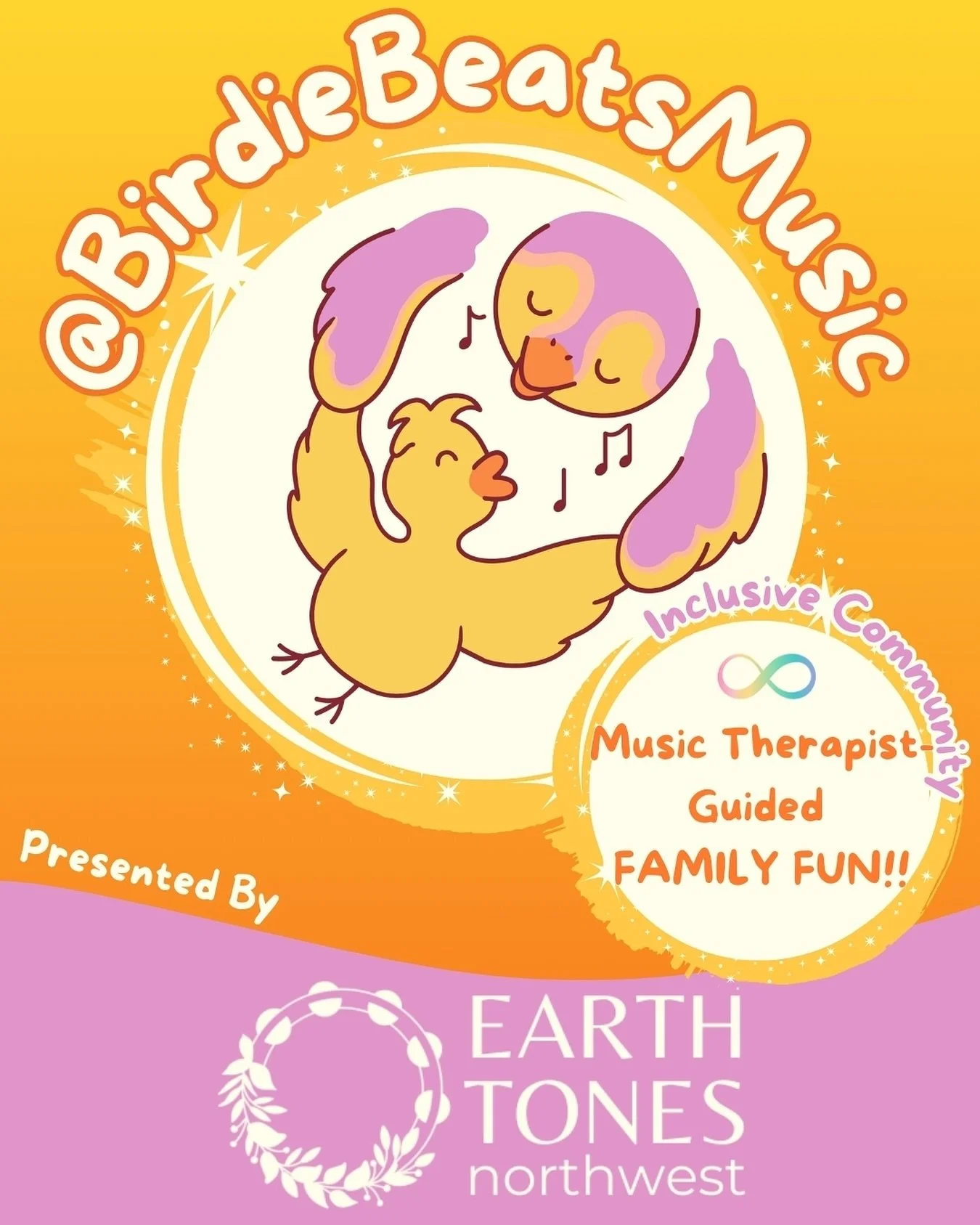 Birdie Beats is an early childhood music program for every child from Earthtones Northwest designed to encourage self-expression, development, and community within a 100% live music experience. Facilitated by Board-Certified Music Therapists, families sing childhood favorites as well as new songs tailored to support specific milestones (including areas of development effected by the pandemic). We sing, dance, play instruments, and enjoy an immersive sensory environment. Come grow with us through music!